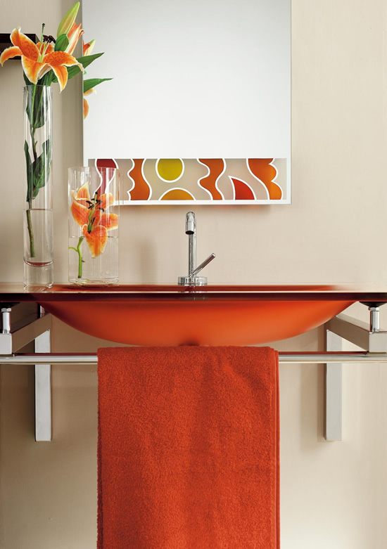 Composition COMPOS 10 in wengè, composed of one base-unit art. MC/C4 measuring cm. 34x36x71h. Copper Crystal top rax93, art. BCT- 17/114 da cm. 114x57,5x16h. supporting structure in stainless steel with towel-rail, art. BCS-4A/80. Handmade mirror with decoration cm.65x90h, lamp art. CAS1. Two shelves in wengè art. MC/F7A cm. 34.