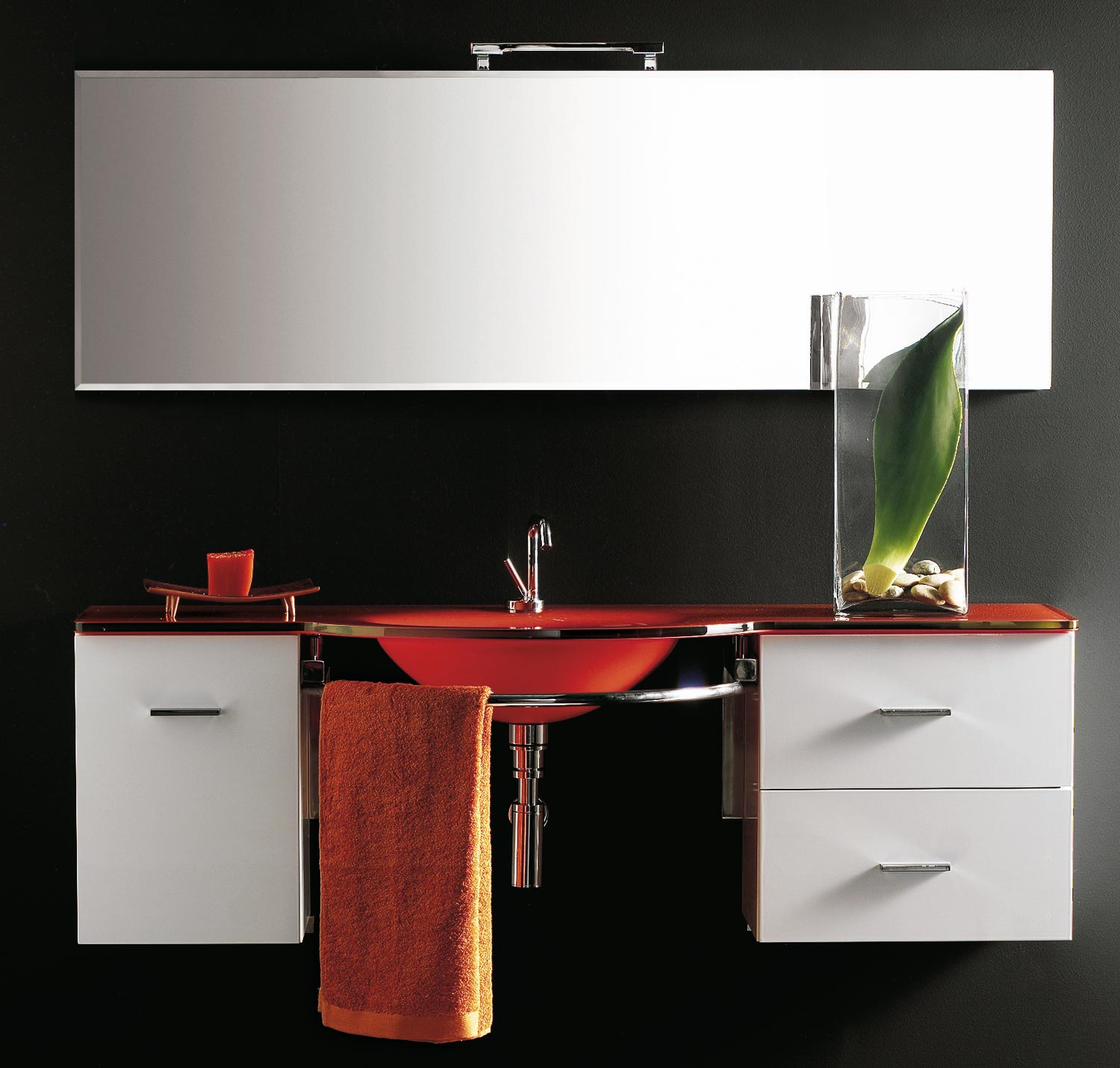COMPOS 110 glossy white composition composed by one base-unit art. COS/D5B cm. 48x36x50h, one base-unit art. COS/B4 cm. 34x36x50h Bordeaux B80- Crystal top art. ST1/150, supporting structure in stainless steel art. BCS-4/70. Mirror art. MC23/150 cm. 150x50h, lamp CAS1.