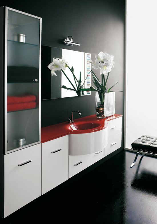 Composition COMPOS 120 in glossy white composed of a washbasin unit art. COS/l1 cm. 68x58x50h, one baseunit art. COS/B4 cm. 34x36x50h, one base-unit art. COS/D5B cm. 48x36x50h. Bordeaux B80 Crystal top - art. ST1/150. Column with glass door, art. CO9/5SV-34 cm. 34x36x158h. Handmade Mirror with decoration art. CS/01, lamp art. GP40.