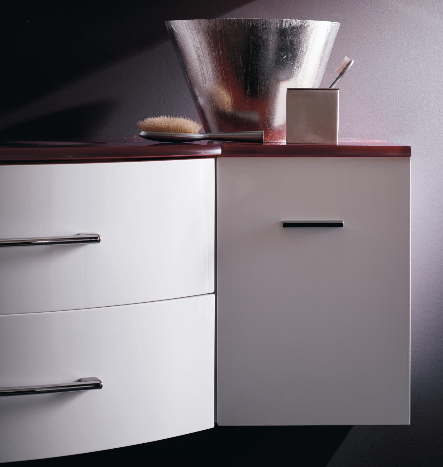 Composition COMPOS 164 in gloss white lacquer with bordeaux red B80 crystal top. The composition is made up of the column art. MC/10SV-34 measuring 34x36x158h cm, the washbasin unit with two baskets art. MC/B12 measuring 106x58x50h cm, the base unit with door art. COS/B4 measuring 34x36x50h cm, the crystal top art. ST1/140, ceramic undertop washbasin art. LUNA measuring 82x40x18h cm, mirror art. BC-5 measuring 115x2x45h cm, wall lamp mini11 chrome and shelf art. MINI10 made of chromeplated brass with bordeaux red B80 glass.