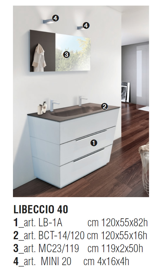 LIBECCIO 40 cm. 120, laccato M87 grigio sabbia opaco, top resina cementizia grigio beige.